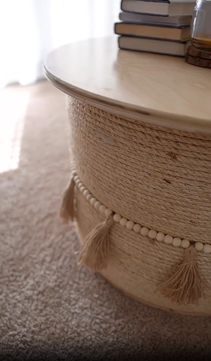Material: Base tejida con cedazo natural, resaltando la durabilidad y la sostenibilidad del material.Cubierta Superior: Superficie de madera lisa y resistente, perfecta para apoyar objetos decorativos, libros o bebidas.Decoración Artesanal: Adornada con borlas y detalles en cuerda que realzan su estiloUsos Versátiles: Puede emplearse como mesa de centro, mesa lateral o incluso como asiento adicional.